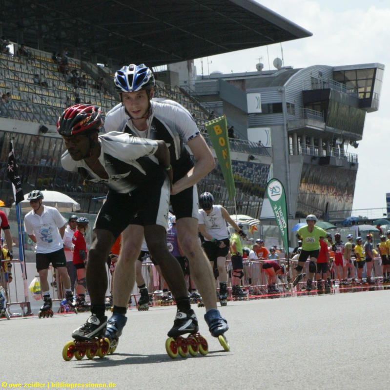 Nos esperan 1.500 m de circuito llano en los que, básicamente, hay que patinar. En cuanto salgamos de las curvas anteriores es el momento, si no lo hemos hecho antes, de buscar compañeros de viaje. Si conseguimos meternos en un grupo podemos hacer este tramo a buen ritmo y disfrutando pero, si vamos solos, se hace duro y largo. Como durante las 24 horas hay tiempo para todo, habrá ocasiones que pillemos un buen pelotón, otras en que tengamos que ir solos y otras en que se nos cuelguen a rueda y nos hagan tirar. Cuando llegamos al final del tramo vemos las tribunas que parecen estar más cerca de lo que realmente están. Todavía falta un último esfuerzo.
